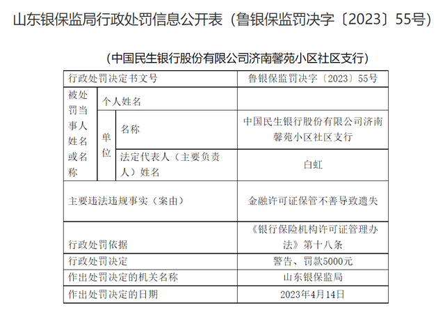 山东银保监局行政处罚信息公开表(鲁银保监罚决字〔2023〕55号)显示,中国民生银行股份有限公司济南馨苑小区社区支行存在以下违法违规事实:金融许可证保管不善导致遗失。中国银行保险监督管理委员会山东监管局根据《银行保险机构许可证管理办法》第十八条的有关规定,对中国民生银行股份有限公司济南馨苑小区社区支行给予警告处罚并罚款5000元。作出处罚决定的日期为2023年4月14日。
