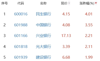 其中,民生银行、中国银行、兴业银行、光大银行、建设银行位列板块涨幅前五位,涨幅分别为4.01%、3.55%、2.21%、2.11%、1.99%。