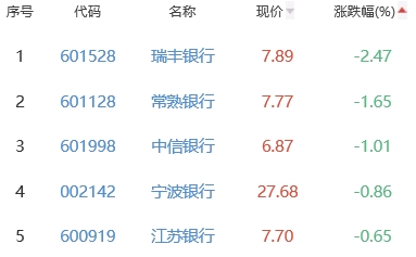 瑞丰银行、常熟银行、中信银行、宁波银行、江苏银行位列涨幅榜后五位,涨幅分别为-2.47%、-1.65%、-1.01%、-0.86%、-0.65%。