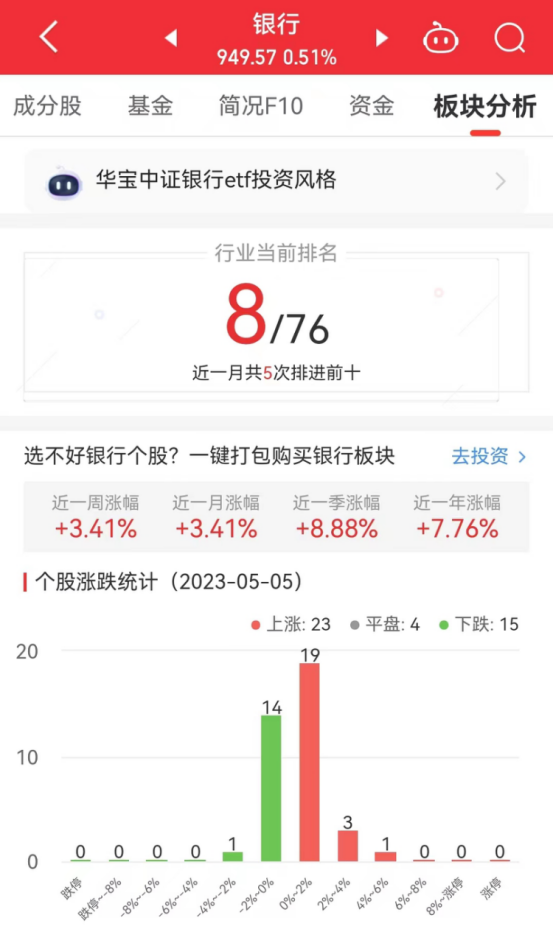 中国经济网北京5月5日讯今日,银行板块整体涨幅0.51%,其中23只股票上涨,4只股票平盘,15只股票下跌。