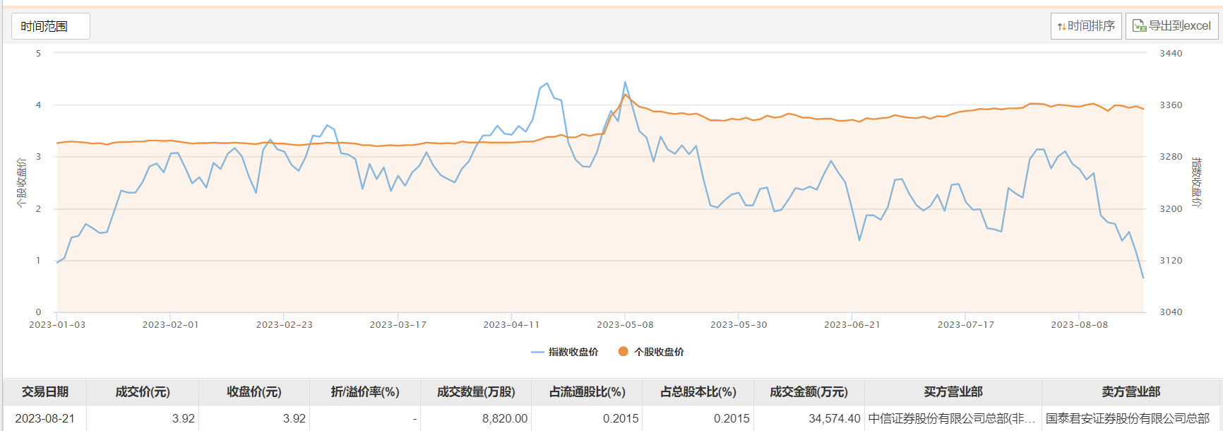 8月21日大宗交易成交8820万股,成交额3.46亿元,占当日总成交额的52.25%,成交价3.92元,较市场收盘价3.92元持平。
