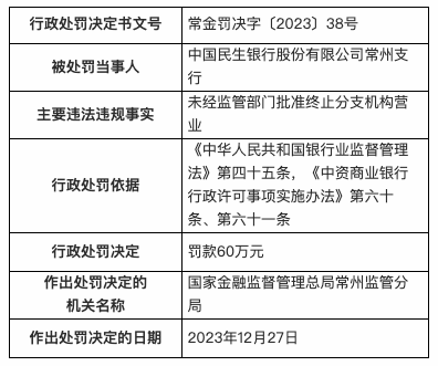 民生银行常州支行被罚60万:未经监管部门批准终止分支机构营业