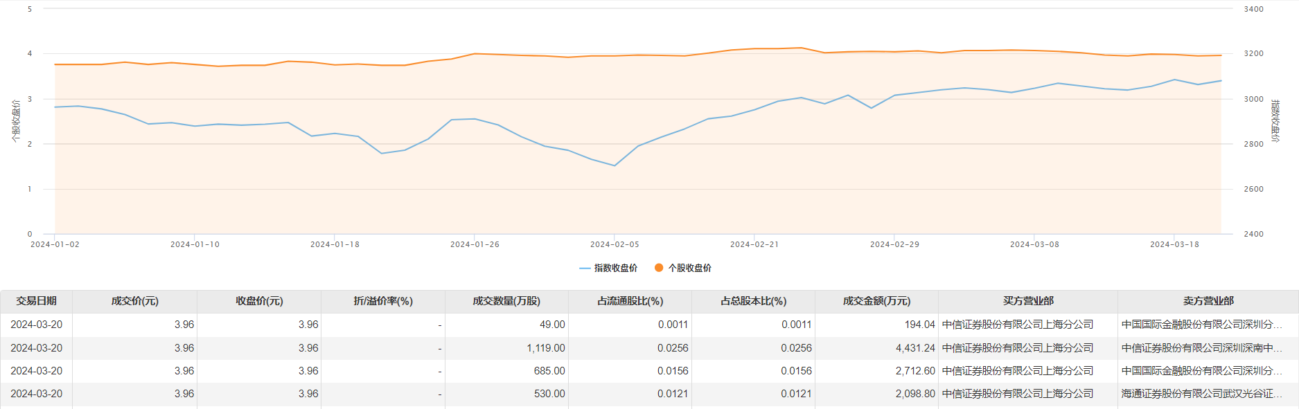 3月20日大宗交易成交2383万股,成交额9436.68万元,占当日总成交额的27.66%,成交价3.96元,较市场收盘价3.96元持平。