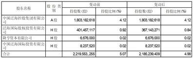 本次权益变动前,泛海集团及其一致行动人持有本行2,219,553,255股无限售流通股,占本行总股本比例为5.07%。本次权益变动后,泛海集团及其一致行动人持有本行2,185,239,409股无限售流通股,占本行总股本比例为4.99%。