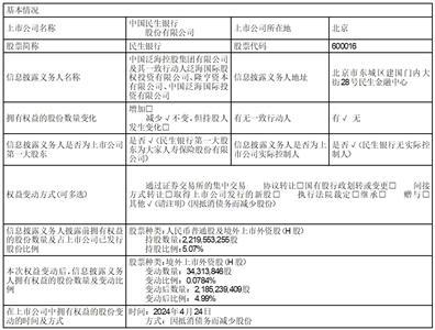 本次信息披露义务人因抵消债务减持34,313,846股,占民生银行总股本的0.0784%。本次减持后,信息披露义务人持有民生银行2,185,239,409股股份,持股比例降至4.99%。