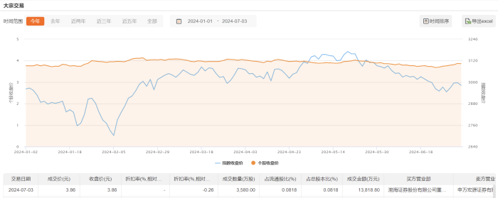 今日大宗交易成交3580万股,成交额1.38亿元,占当日总成交额的20.9%,成交价3.86元,较市场收盘价持平。