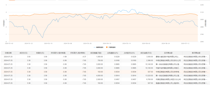 7月25日大宗交易成交1.4亿股,成交额4.74亿元,占当日总成交额的23.57%,成交均价3.39元,较市场收盘价3.56元折价4.78%,其中最高成交价3.5元,最低成交价3.38元。