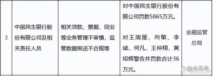 10月31日,国家金融监督管理总局发布的行政处罚信息公示列表显示,中国民生银行股份有限公司因贷款、票据及同业业务管理不审慎、监管数据报送不合规等违法违规行为,被处以5865万元罚款。与此同时,王周屋、向敏、李斌、何凡、王仲翔、黄绍辉6名相关责任人分别被予以警告,并合计罚款36万元。据不完全统计,民生银行及其分支机构2025年被罚没金额超8600万元。