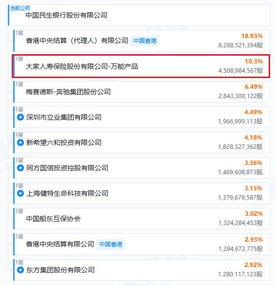 大家保险目前是民生银行的境内法人第一大股东,持有该行73亿股,在流通股中占比16.79%,而赵鹏是大家保险集团派驻民生银行的董事。