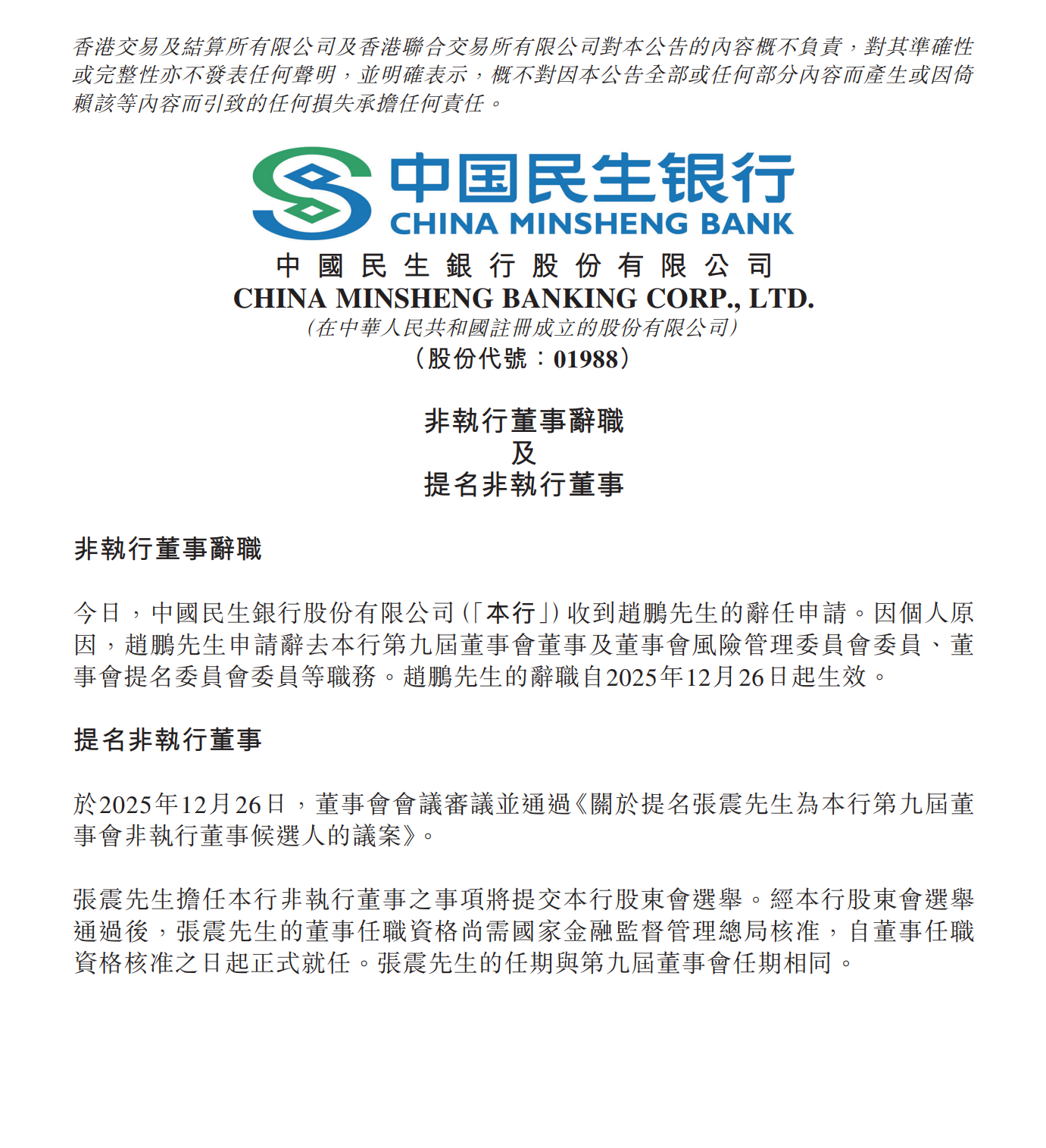 12月26日,中国民生银行股份有限公司(下文简称为“民生银行”)发布公告称,董事赵鹏因个人原因申请辞去该行董事及董事会风险管理委员会委员、董事会提名委员会委员等职务,辞职自2025年12月26日起生效。辞职后,赵鹏不在公司及控股子公司工作。