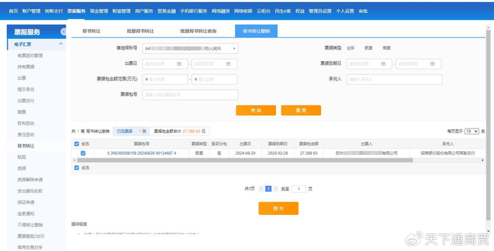 接下来点击 票据服务 - 电子汇票 - 背书转让 - 背书转让撤销,选择账号,票据类型选择“全部”,再点“查询”,只要符合条件可供撤销的新一代票据,都会在列表中显示出来。选择需要撤销的票据,再点“提交”,按提示完成撤销的经办操作。