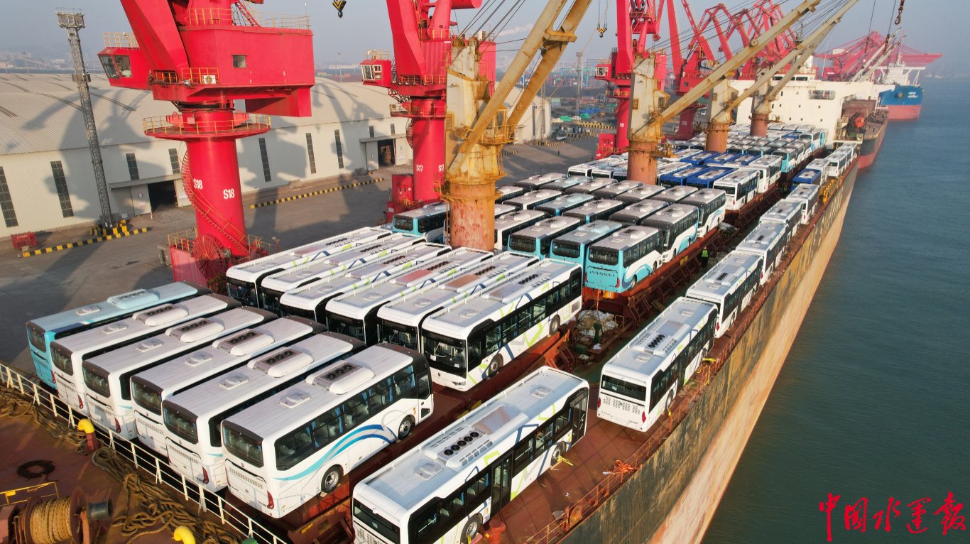 载有185辆国产大巴车的件杂货班轮从山东港口日照港启航驶往非洲