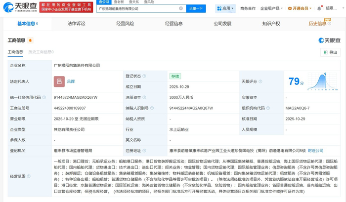 天眼查App显示,近日,广东揭阳前詹港务有限公司成立,法定代表人为吕晖,注册资本3000万人民币,经营范围包括港口理货、无船承运业务、船舶港口服务、港口货物装卸搬运活动等。股东信息显示,该公司由国电投(揭阳)前詹港电有限公司、上港集团物流有限公司共同出资。