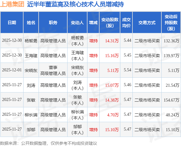 上港集团近半年内的董监高及核心技术人员增减持详情如下: