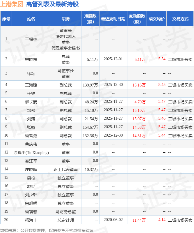 上港集团的高管列表及最新持股情况如下: