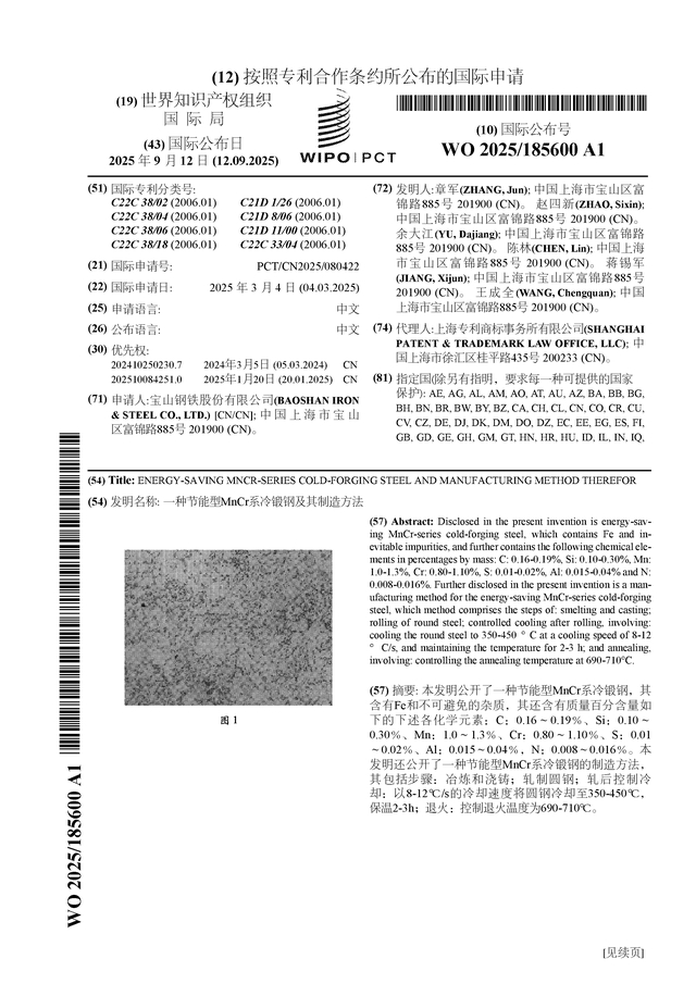 宝钢股份公布国际专利申请:“一种节能型MnCr系冷锻钢及其制造方法”