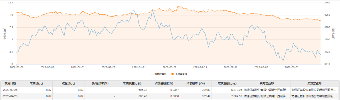 9月26日大宗交易成交1406.72万股,成交额1.25亿元,占当日总成交额的35.37%,成交价8.87元,较市场收盘价8.87元持平。