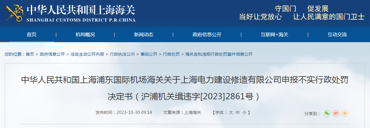 上海浦东国际机场海关关于上海电力建设修造有限公司申报不实行政处罚决定书(沪浦机关缉违字[2023]2861号)