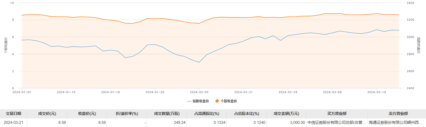 3月21日大宗交易成交349.24万股,成交额3000万元,占当日总成交额的17.78%,成交价8.59元,较市场收盘价8.59元持平。