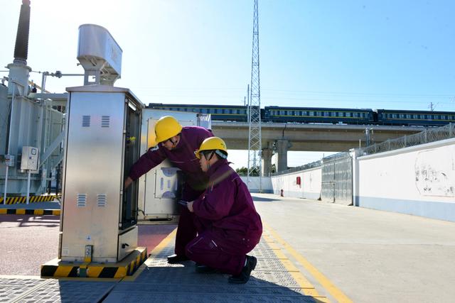 国网上海松江供电公司工作人员曹辉、陈俊来到220千伏沪苏湖高铁松江牵引变电站,为该站供电线路及关键电气设备开展严格细致检查,确保元旦期间铁路列车牵引站安全可靠供电
