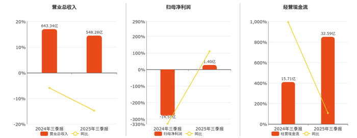 公司营业总收入为548.28亿元。归母净利润为1.40亿元,较去年同报告期归母净利润增加15.91亿元。经营活动现金净流入为32.59亿元,较去年同报告期经营活动现金净流入增加16.88亿元,实现2年连续上涨,同比较去年同期上涨107.45%。