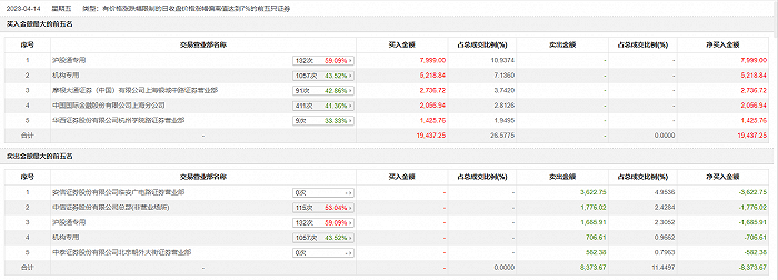 具体来看,机构买入5218.84万元,卖出706.61万元,合计净买入4512.23万元。此外,沪股通专用、摩根大通上海银城中路证券营业部分别买入7999.00万元、2736.72万元;安信证券临安广电路证券营业部、中信证券总部(非营业场所)分别卖出3622.75万元、1776.02万元。