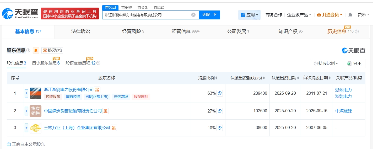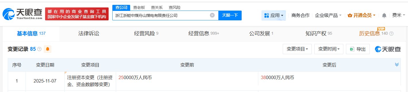 每经AI快讯,天眼查工商信息显示,近日,浙江浙能中煤舟山煤电有限责任公司发生工商变更,注册资本由25亿元人民币增至38亿元人民币,增幅52%。该公司成立于2007年6月,法定代表人为朱青国,经营范围包括城市基础设施类项目的开发建设和运营、配电网建设与经营等。股东信息显示,该公司由浙能电力(600023)、中国煤炭销售运输有限责任公司、三林万业(上海)企业集团有限公司共同持股。
