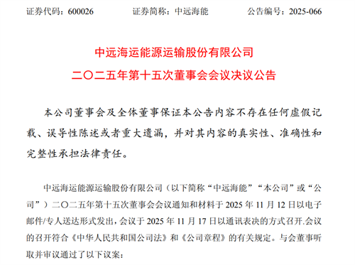 11月17日,中远海运能源运输股份有限公司发布《二O二五年第十五次董事会会议决议公告》,审议并通过多项人事任命议案。