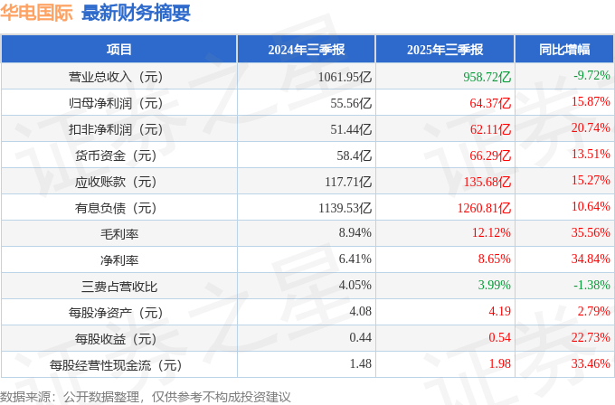 据证券之星公开数据整理,近期华电国际(600027)发布2025年三季报。截至本报告期末,公司营业总收入958.72亿元,同比下降9.72%,归母净利润64.37亿元,同比上升15.87%。按单季度数据看,第三季度营业总收入359.2亿元,同比下降10.92%,第三季度归母净利润25.33亿元,同比上升20.32%。本报告期华电国际盈利能力上升,毛利率同比增幅33.36%,净利率同比增幅21.52%。