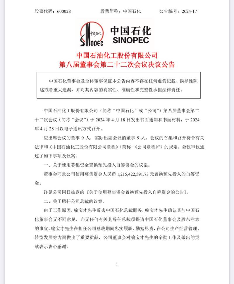 发布公告,其中提到,董事会聘任赵东先生为中国石化总裁,同时调整为执行董事,聘期自董事会批准之日起至第八届董事会任期届满时止。