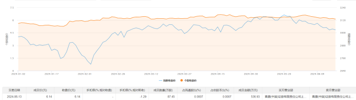 6月13日大宗交易成交87.45万股,成交额536.93万元,占当日总成交额的0.57%,成交价6.14元,较市场收盘价6.14元持平。