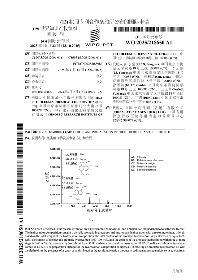 中国石化公布国际专利申请:“烃类组合物及其制备方法和应用”