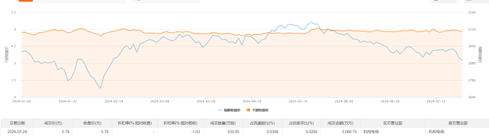 7月24日大宗交易成交530万股,成交额3068.7万元,占当日总成交额的19.11%,成交价5.79元,较市场收盘价5.79元持平。
