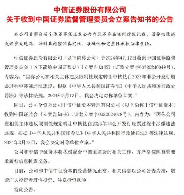 中新网4月12日电 4月12日晚间,中信证券发布公告,公司于2024年4月12日收到证监会《立案告知书》,因公司在相关主体违反限制性规定转让中核钛白2023年非公开发行股票过程中涉嫌违法违规,2024年3月13日,证监会决定对公司立案。同日,公司全资孙公司中信中证资本管理有限公司(以下简称中信中证资本)亦收到中国证监会《立案告知书》。公司和中信中证资本将积极配合中国证监会的相关工作,并严格按照监管要求履行信息披露义务。(中新财经)