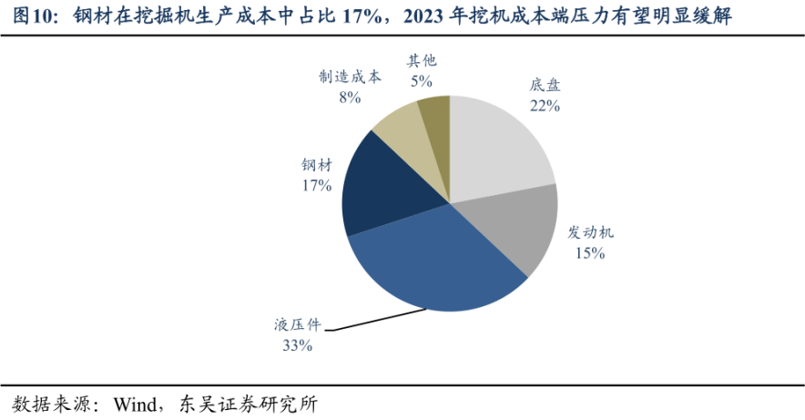 首先,从成本构成上看,钢材在工程机械制造成本中的比例约为20%,工程机械行业盈利能力受原材料钢材价格影响较大。2022年下半年以来,受国际形势动荡、美元加息等因素影响,钢铁市场需求超预期下滑,钢材价格持续走弱,三一重工成本端压力得到一定缓解。