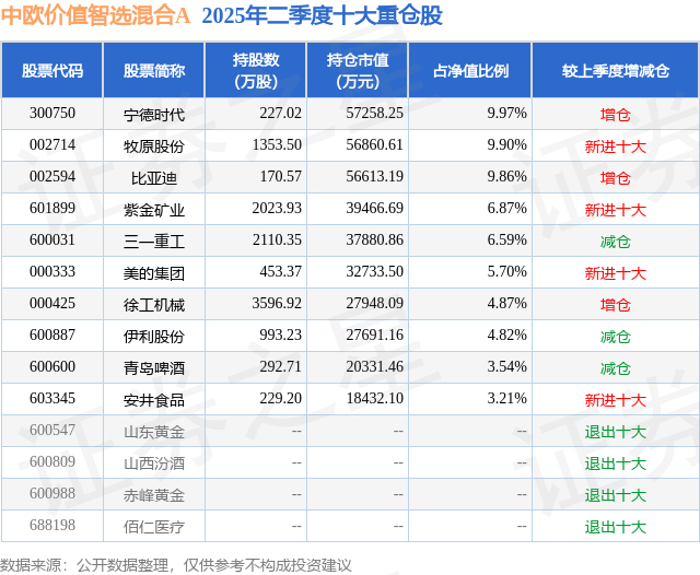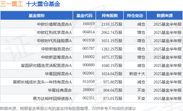 根据2025基金半年报公募基金重仓股数据,重仓该股的公募基金共151家,其中持有数量最多的公募基金为中欧基金的中欧价值智选混合A。中欧价值智选混合A目前规模为34.28亿元,最新净值5.2691(9月18日),较上一交易日下跌1.42%,近一年上涨65.05%。该公募基金现任基金经理为袁维德。袁维德在任的基金产品包括:中欧睿泓定开混合,管理时间为2018年3月28日至今,期间收益率为147.49%;中欧新兴价值一年持有混合A,管理时间为2021年9月6日至今,期间收益率为10.39%;中欧多元价值三年持有混合A,管理时间为2022年1月26日至今,期间收益率为11.93%。