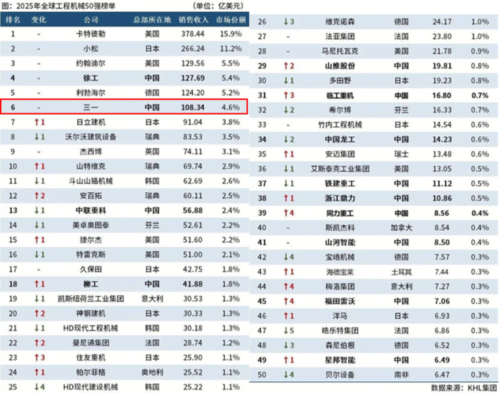 但从市场分布来看,全球主要工程机械市场仍由欧美日企业主导,2025年卡特彼勒、小松分别以15.9%、11.2%的市场份额占据全球冠亚军。