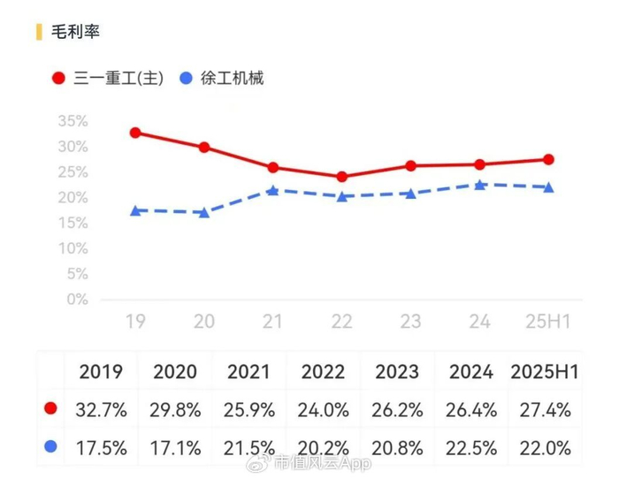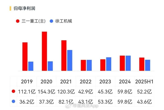 反映在利润端,营收相差百亿的三一重工,却能在归母净利润上与徐工机械基本持平,2025年上半年甚至反超近10亿。