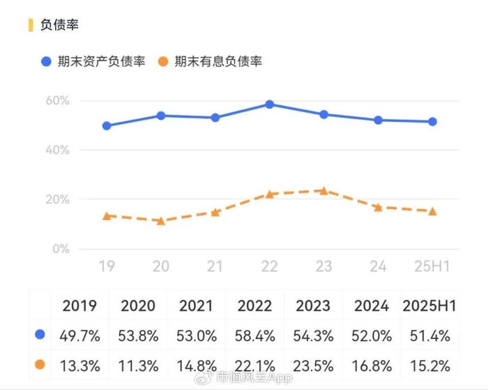 与此同时,公司的长短期借款合计不过190亿元,有息负债率仅为15.2%,整体资产负债率51.4%,也处于健康水平。