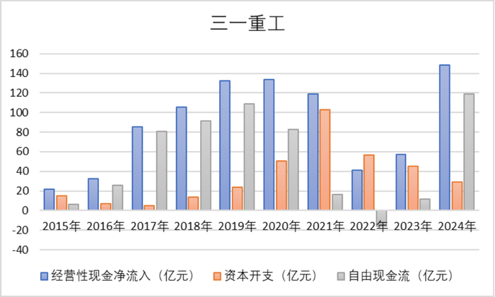 这些对三一重工而言仿佛成了“印钞机”般的存在。2015-2024年短短十年时间,在全国基建投资、房地产开发热潮下,累计为公司带来经营性净现金流876.3亿。扣除不菲的资本开支后,余下的自由现金流合计仍高达526.73亿。