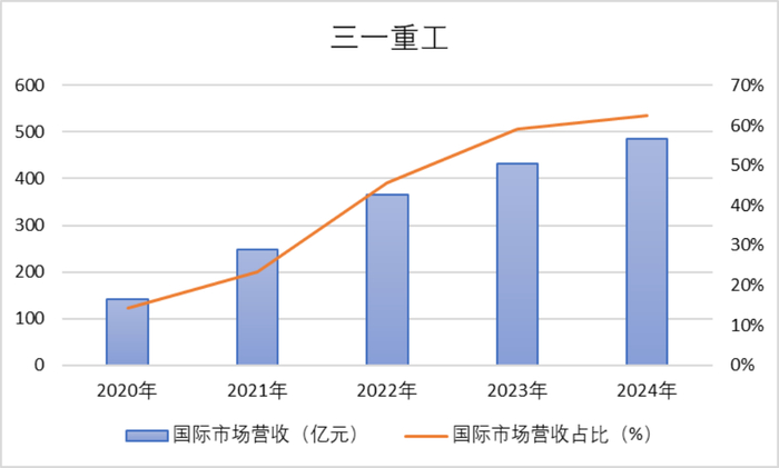 2020-2024年,三一重工的海外营收从141亿高增至485亿,近乎翻了3.5倍,在总营收中的占比也从14.2%提升至62.38%。2025年上半年,海外营收延续增势,同比增长11.72%至263亿元,营收占比保持在60%以上。
