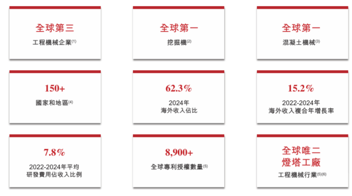 根据弗若斯特沙利文数据,按照2020-2024年核心工程机械的累计收入计算,三一重工已成为全球第三大及国内第一大的工程机械企业。