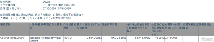 三一重工(06031.HK)获Temasek Holdings (Private) Limited增持259.42万股