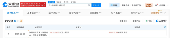 雷达财经讯,天眼查App显示,近日,三一重工(600031)发生工商变更,注册资本由约84.74亿人民币增至约91.95亿人民币,增幅约8.5%。