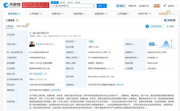 三一重工股份有限公司成立于1994年11月,法定代表人为向文波,经营范围含生产建筑工程机械、起重机械、停车库、通用设备及机电设备等的销售与维修,提供建筑工程机械租赁服务,经营商品和技术的进出口业务等。股东信息显示,该公司由三一集团有限公司、香港中央结算有限公司、梁稳根等共同持股。