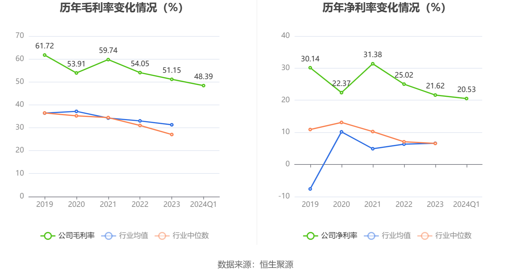2024年第一季度,公司毛利率为48.39%,同比下降1.64个百分点;净利率为20.53%,较上年同期上升2.08个百分点。