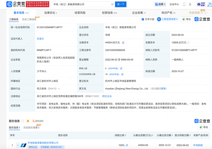 企查查信息显示,该公司成立于2022年6月,法定代表人为厉逸文,经营范围包含发电业务、输电业务、供(配)电业务等,由华电新能(600930)全资持股。