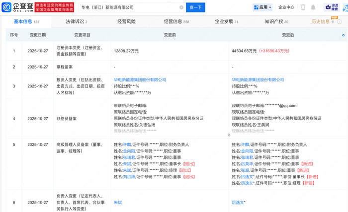 企查查APP显示,近日,华电(浙江)新能源有限公司发生工商变更,注册资本由约1.28亿人民币增至约4.45亿人民币,增幅约247%,同时,多位主要人员发生变更。