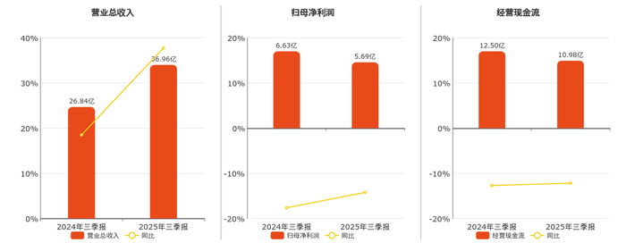 公司营业总收入为36.96亿元,在已披露的同业公司中排名第8,较去年同报告期营业总收入增加10.13亿元,实现3年连续上涨,同比较去年同期上涨37.73%。归母净利润为5.69亿元,在已披露的同业公司中排名第9,较去年同报告期归母净利润减少9430.08万元,同比较去年同期下降14.22%。经营活动现金净流入为10.98亿元,在已披露的同业公司中排名第10,较去年同报告期经营活动现金净流入减少1.52亿元,同比较去年同期下降12.18%。