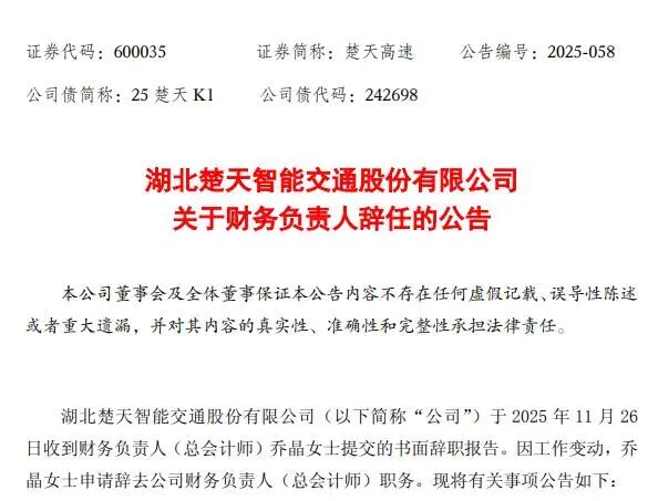 11月28日晚,楚天高速(证券代码:600035)发布公告称,财务负责人(总会计师)乔晶因工作变动辞职。辞任后,不再担任公司及控股子公司任何职务。